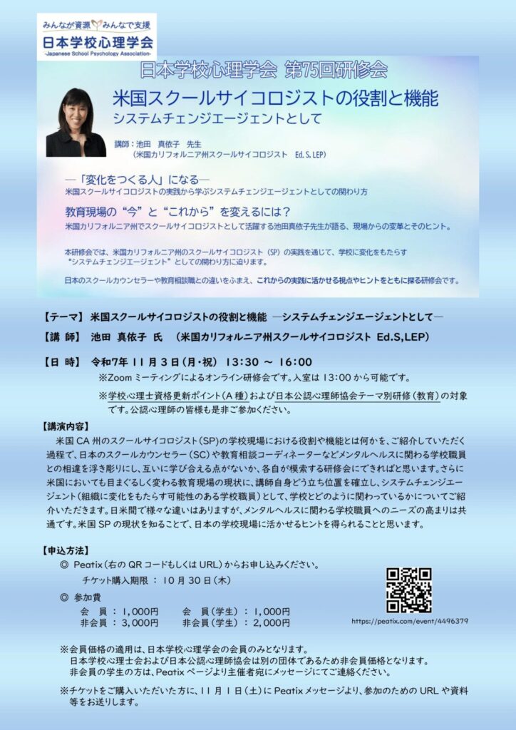 ●講演内容:米国CA州のスクールサイコロジスト(SP)の学校現場における役割や機能とは何かを,ご紹介していただく過程で,日本のスクールカウンセラー(SC)や教育相談コーディネーターなどメンタルヘルスに関わる学校職員との相違を浮き彫りにし,互いに学び合える点がないか,各自が模索する研修会にできればと思います。さらに米国においても目まぐるしく変わる教育現場の現状に,講師自身どう立ち位置を確立し,システムチェンジエージェント(組織に変化をもたらす可能性のある学校職員)として,学校とどのように関わっているかについてご紹介いただきます。日米間で様々な違いはありますが,メンタルヘルスに関わる学校職員へのニーズの高まりは共通です。米国SPの現状を知ることで,日本の学校現場に活かせるヒントを得られることと思います。